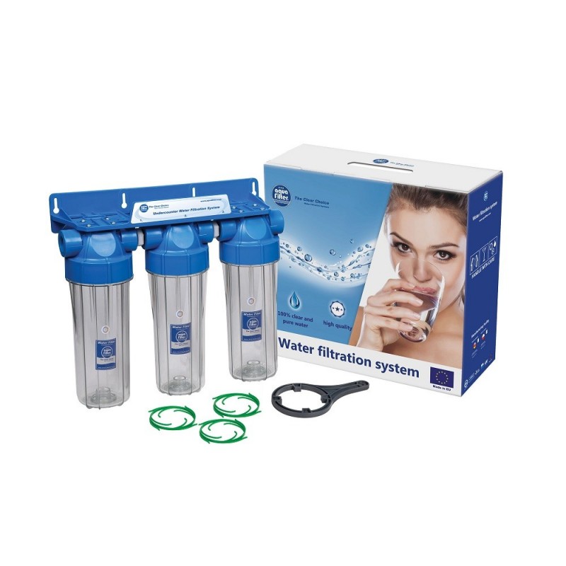 Set de filtrare TRIPLE de 10" este destinat filtrarii apei reci.   Filtru FHPLCL12-D-TRIPLE de 10" -  sistem cu doua filtre transparente cu capete albastre, sunt filtre pentru locuinta. ..