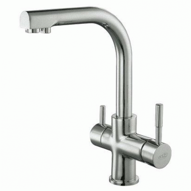 Baterie cu 3 cai pentru chiuveta de la bucatarie din alama cromat. Se foloseste pentru alimentare cu apa rece, apa calda si apa plata filtrata.