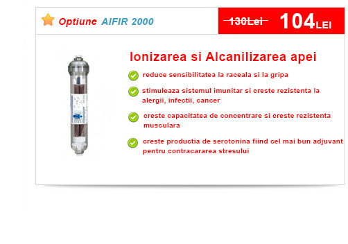 Pe langa ionizarea apei, filtrare si purificare, scapi atat de Bisfenol A, de caratul apei zilnic de la magazin dar vei face si o economie de bani considerabila. Ulterior, poate lucrurile se mai schimba si iti vei putea cumpara propriul cartus de ionizare negativa a apei care se poate adauga sistemului standard.