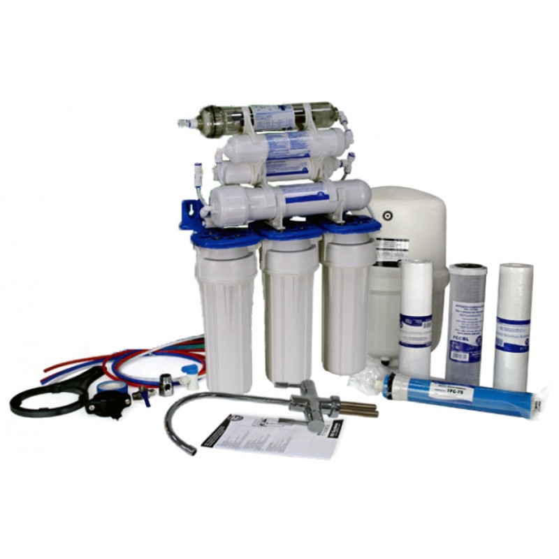 Purificator Apa prin Osmoza Inversa Aqua cu STERILIZATOR UV RO7PMUV. Sistemul include un set complet de cartuse, membrana osmotica, adaptori, robinet (baterie simpla/ dubla), cheie, tanc. Consumabilele pentru acest sistem de filtrare sunt Membrana Osmotica TFC-50F sau Membrana Osmotica TFC-75F(care se schimba odata la 3 ani), Setul de cartuse RO5( care se inlocuieste odata la 6 luni) si lampa UV de la Sterilizatorul UV(se inlocuieste la 12 luni). Le gasiti pe toate la Produse Asociate. Osmoza inversa este proectata sa lucreze la o presiune de min. 2.5 bar pana la max. 6 bar. In cazul in care nu aveti presiunea la intrare de 2.5 bari trebuie sa alegeti un model cu pompa.