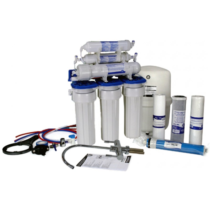 Sistemul include un set complet de cartuse, membrana osmotica, adaptori, robinet, cheie, tanc.  Sistemele de Osmoza Inversa sunt perfect potrivite pentru a furniza apa filtrata pura*apa plata direct de robinet. Sistemul este dotat cu un robinet foarte subtire care se ataseaza la chiuveta sau se integreaza in chiuveta dvs. Consumabilele pentru acest sistem sunt: Setul de cartuse RO4( care se inlocuieste o data la 6 luni) si o membrana osmotica(se schimba odata la 3 ani).Osmoza inversa este proectata sa lucreze la o presiune de min. 2.5 bar pana la max. 6 bar. In cazul in care nu aveti presiunea la intrare de 2.5 bari trebuie sa alegeti un model cu pompa.
